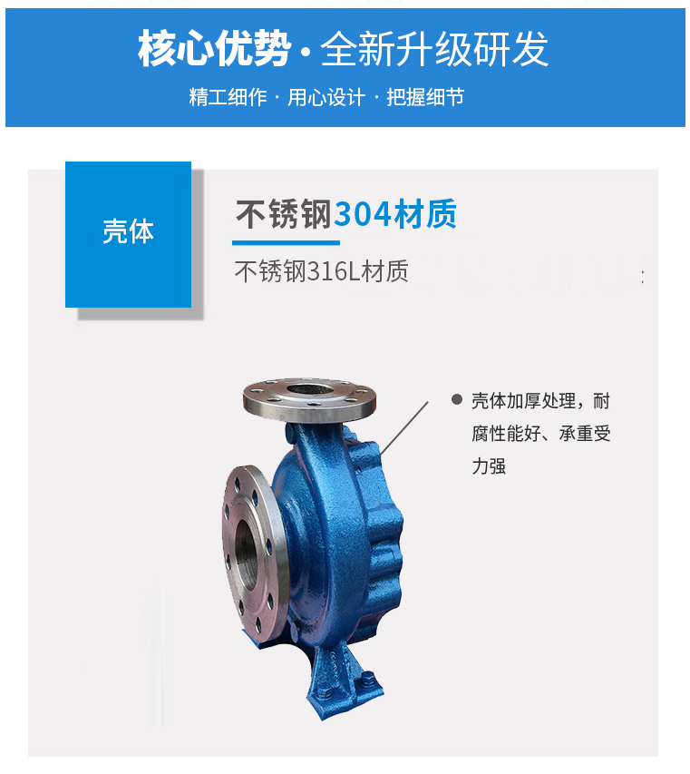 2.泵體、泵蓋、葉輪等過流部件均采用優質不銹鋼材料,新工藝一次精密鑄造而成,無雜質,無氣孔,沙眼,可選用2205雙相不銹鋼等優質合金耐磨材料;